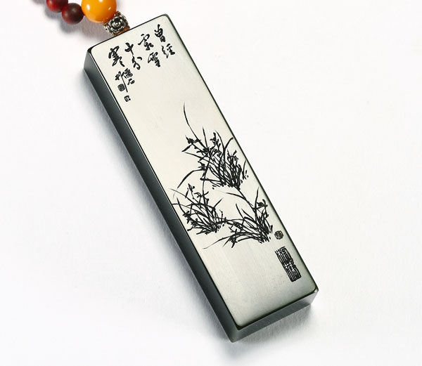 这件《青玉籽料曾经霜雪十分寒》,阴刻叶片,廖廖数笔,洒脱却见深厚功底,淡点花朵,独具清幽风致,笔法遒劲,将兰花历经霜雪的坚韧和芳魂刻画出来。背面文字“素心兰与赤心兰,总把芳心与客看。岂是春风能酿得,曾经霜雪十分寒”即是对面画的注解,同样是阴刻,大气雅致,体貌疏朗,显示了作者超凡的雕工和书法造诣。整件作品以有力的笔触写出兰之韵,与郑板桥的原作如出一辙。