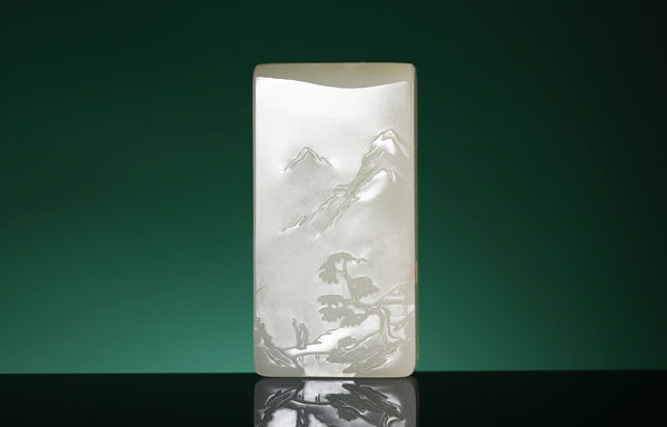 这件玉牌,明显是受到吴门画派的影响,山高路远,贤者访友,这恐怕是真正的文人才有的闲情和淡远。同时,他对对绘画笔墨在玉器上的运用是极其审慎的,尽量用极简洒脱的线条,适时地虚化和渲染,将文人的淡泊明志,宁静致远描绘得很精到。
