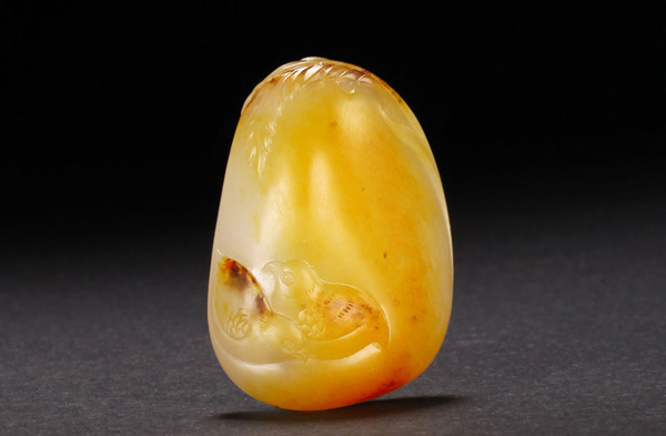 由黄沁色和田玉料雕就的“岁岁平安”挂件可谓是俏色巧雕之典范,作者将略带黄褐色的玉皮巧妙设计为两只鹌鹑的羽翼,而上部的一抹黄褐色玉皮雕琢为稻穗,取其谐音,寓意“岁岁平安”,黄艳的皮色与莹润的玉质相映成趣。这件由中国玉雕大