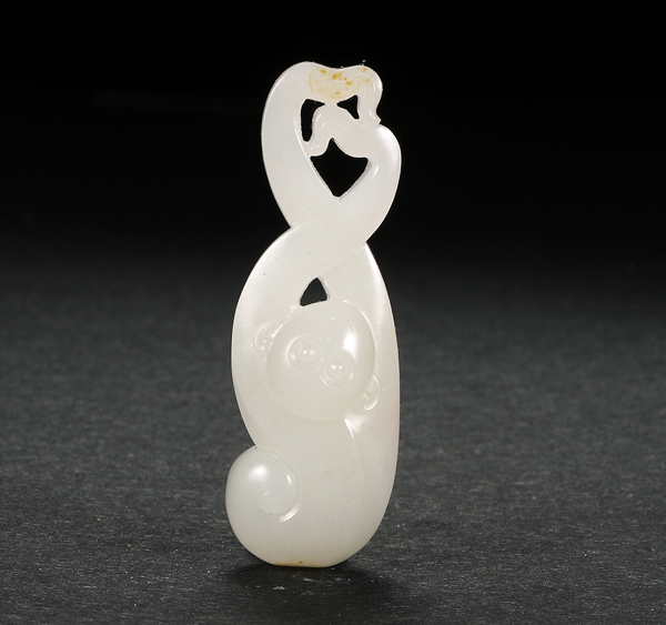 和田玉籽料灵猴挂件,作者郭万龙。这件作品最大的特色就是用曲线刻画出灵猴上肢的动态,让人不禁联想到美猴王孙悟空的机灵样儿和之前在微博上大热的“宠物猴”,真是惟妙惟肖,灵动可爱。