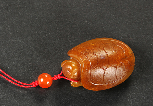 这件作品利用原材料整体的黄沁,金红的色彩,雕琢为一只憨实的小金龟,亮丽可爱,让人不得不反复把玩与摩挲,似乎这只小金龟会活过来似的。同时作品寓意吉祥,取富贵长寿之意。
