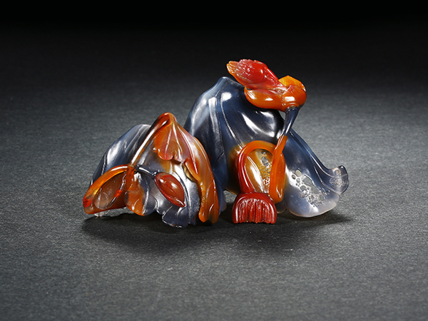 玛瑙 荷趣笔架,该作品采用玛瑙雕琢,利用玛瑙天然的色彩,雕成荷叶与荷花,并且采用中国画的手法,用墨色琢为荷叶,红色雕为荷花,另雕一直小鸟立于荷花之上。而此作品还有实用价值——笔架,相比此笔架置于书房案头,必定别有一番清趣。