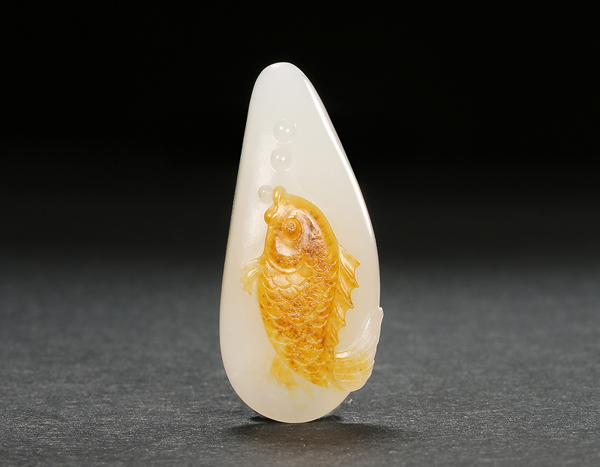 和田玉籽料鱼跃挂件,作者吴灶发。此作品色彩分明,作者利用俏色雕成一只金鱼,好似鱼鳞金光闪闪,作者构思巧妙,金鱼呈跃起之态,口中还吐着泡泡,像极了家中饲养的金鱼跃出水面吐泡泡的形象,可谓是动态十足,灵气十足!