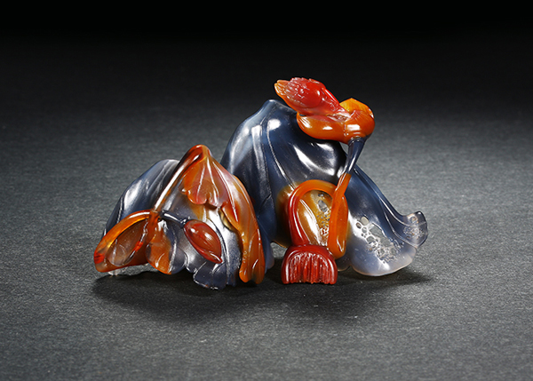 此件作品选材于玛瑙,作者充分利用了玛瑙颜色的丰富性,创作了萧瑟秋日残荷听雨之景象。玛瑙一直以来不太受重视,但玛瑙颜色的丰富性非常有创作空间。此作品将残荷与莲叶以及枯萎扭曲的枝干描绘得惟妙惟肖,秋日萧瑟之景跃然呈现。