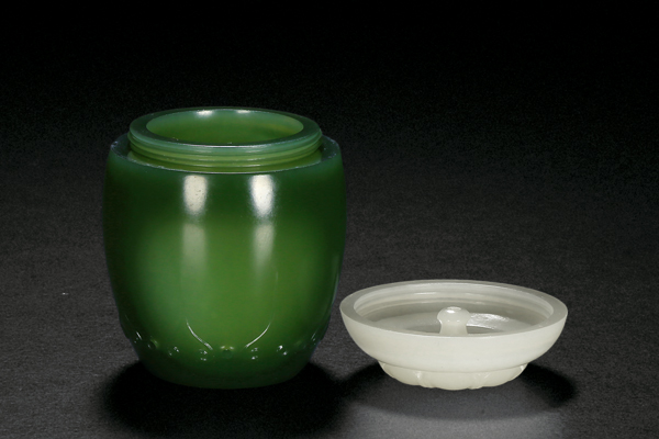 这件作品分为两个部分,白玉香盖与碧玉香炉。做工极为严谨、简约,造型十分古朴、规整。炉口与炉腹的弧面娴雅流畅,与器形线条的结合十分完美。玉质极为细腻,油性亦足。值得一提的是,白玉雕制的香盖合于炉口之上可用作香薰炉,安于底座凹洼处又可当作香插,真是构思巧妙,别具匠心。
