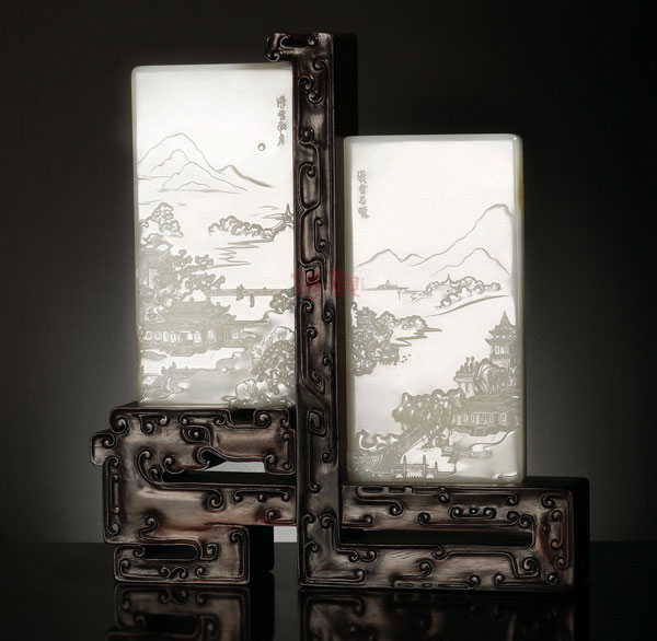 LOT 11478 中国玉石雕刻大师陈冠军作品 和田玉籽料汉宫春秋插牌