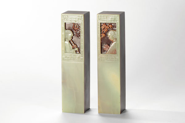 在印章周身的装饰方面,第八期“玲珑美玉”的拍品中也出现了一对十分新颖的作品,印章侧面的纹饰从花草纹饰图案变为富有情调的画面,即便不懂赏寿山之美的者见了也可细细品位一番。一对外形方正的长方体印章侧面雕刻的是两幅闺中少女的画面,加之材质内部的天然暗色背景使得画意更浓。欣赏两枚印章装饰,如赏两幅精致画作,十分悦目。