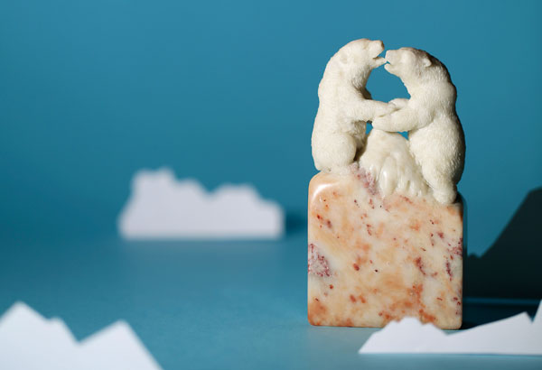 北京博观第八期“玲珑美玉”征集到的部分寿山印章,在印钮雕刻上明显有了突破,设计者改变了以往简单传统的造型,内容复杂化,场景化,主题相对突出。冰天雪地里争斗的熊,童子洗象的生动情节,一只新生而略显娇羞的蜗牛等主题设定已经十分明确,艺术性不言而喻。这些印纽多采用俏色巧雕,意趣横生,,可欣赏性大大增加,视之为独立的石雕艺术也未尝不可。