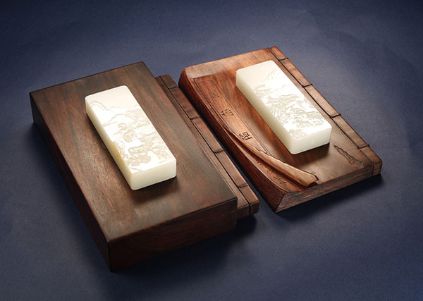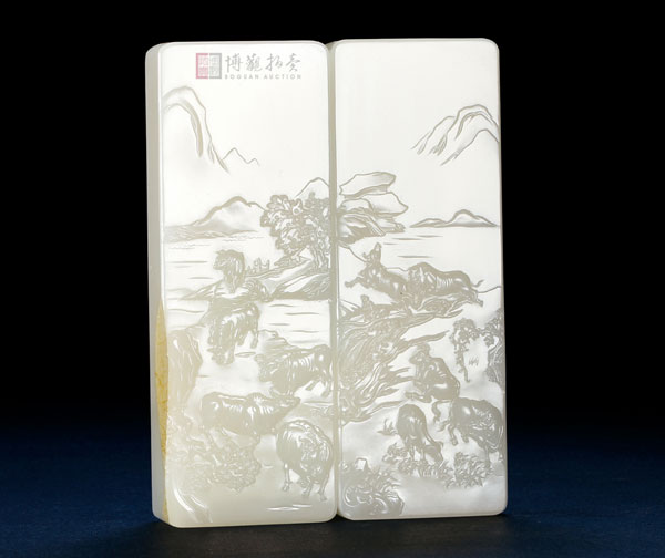 作品为和田玉籽料山水套牌,但与通常的套牌不同,两牌可分可合,合便是完整的山水景观,分也能单独成景而不失趣味。正面为江南田间精致,刻画十头耕牛,耕牛或立或卧,或俯首吃草或昂头远望,姿态各异,状物精细。背面一改正面气息,以恢弘旷逸取意,千里山,万里水,集于玉上,可谓“尺山寸水,万丈自然”。此对牌用料足实,玉质细腻油润,一物两用,既可作玉佩,亦可作镇纸,放置于书房案头。