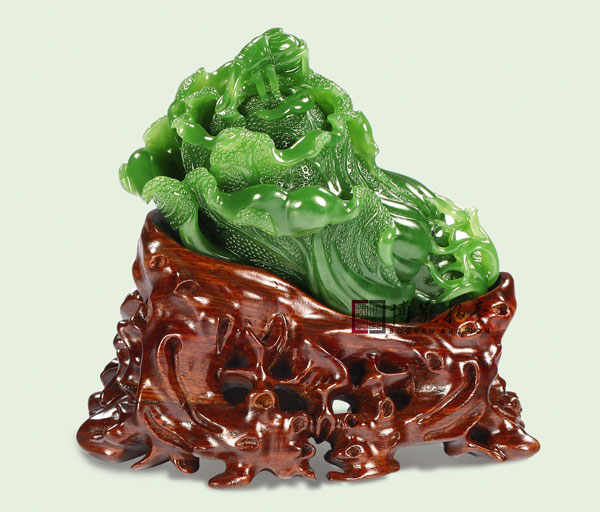 白菜为碧玉质,颜色沉稳,玉质细腻,且均一无杂,为俄罗斯所产的上等碧玉。白菜叶片的翻卷也处理的比较自然,犹若天工。在中国玉雕文化中,讲究玉必有工,工必有意,意必吉祥,“玉白菜”这一玉雕题材也具有吉祥寓意,寓意“百财”和“一清二白”。