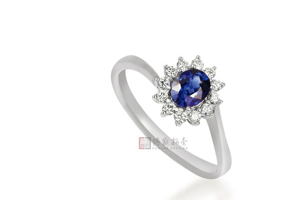 蓝宝石净度高,湛蓝颜色均匀饱满,碎钻环绕周围,设计简洁大方。