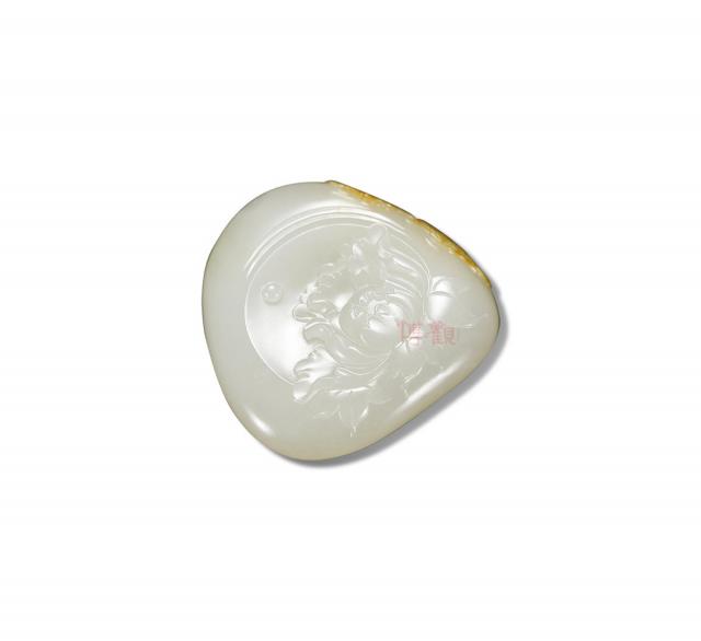 作品形制圆融,玉质优美。浮雕的牡丹端庄大气,富贵灵动,质感逼真。一抹皮色亦细细巧雕,备添佳趣。整体观之,细节精致,构图和谐,美感丛生。