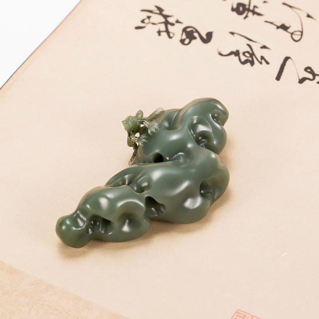 此件作品为和田玉青玉材质,颜色淡雅清新,质地细腻油润,结构紧密,作品采用镂雕和立体浮雕相结合,整体造型为一块体量感较大的太湖石,分布错落有致,颇具意境之美;山石上还有一只体态灵巧、动态十足的青蛙,细节之处自然精细,别具趣味,作为镇纸或摆件都是一款不可多得的作品。款识:德