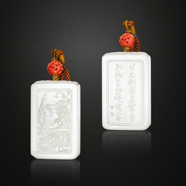 作品由新疆和田玉籽料雕刻而成,所选玉料色泽匀净清润,玉质细腻无瑕。作品在传统的玉牌造型上有所创新,以较高的厚度增强了作品的体量感,整体轮廓简约雅致。牌子正面描绘出远山繁树映衬下的殿宇楼阁,背面则用飘逸流畅的行书雕刻出唐代诗人张祜的诗句“日光斜照集灵台,红树花迎晓露开”,虽无一个人影,却从侧面描绘出一派盛唐的太平安逸景象。作品顶部层叠覆盖的松针则更加增强了悠远葱郁的山野之气。