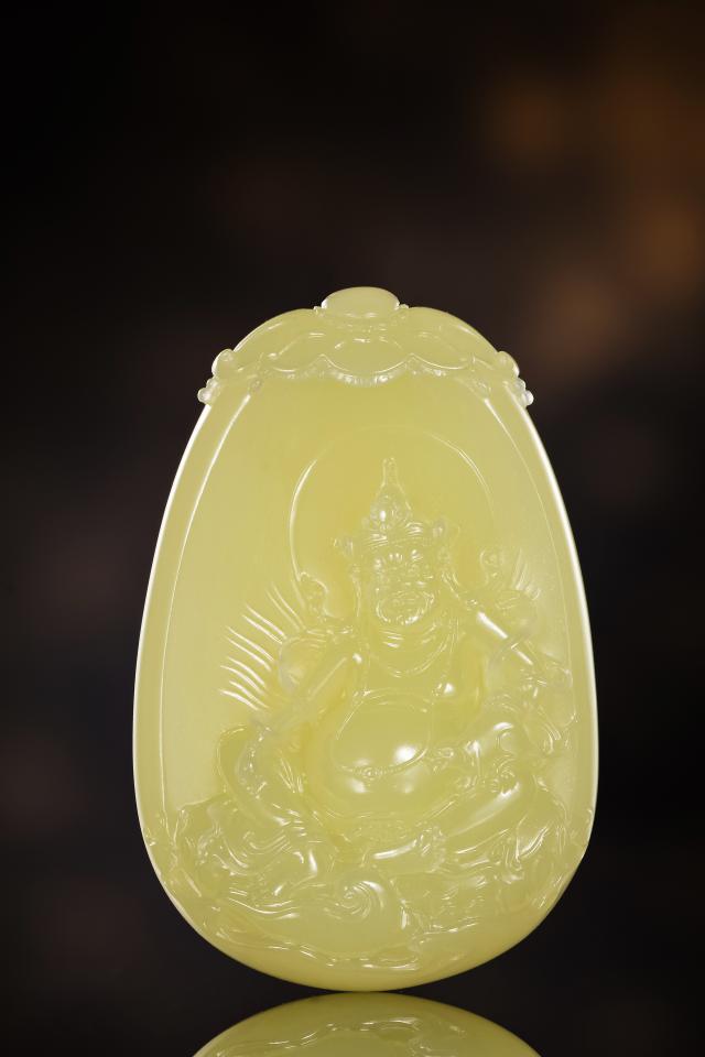 黄财神是藏传佛教各大教派普遍供养的五姓财神之首,主司财富,能使一切众生脱于贫穷,因其身相黄色,故名黄财神。作品选材黄玉,玉质细润油润,颜色均一,色泽明快雅致。以华盖为牌头,玉牌正面以高浮雕技法刻画黄财神法相,头戴宝冠,虎目圆睁,威风凛凛,左手抚吐宝鼠,右手托宝珠,脚踏海螺,象征着他能入海取宝。背面刻摩尼宝珠,寓意心想事成。精细华美的高浮雕极具立体感,整体风格刚劲硬朗不失清雅,是收藏佩戴的不二之选。款识“永昌”。