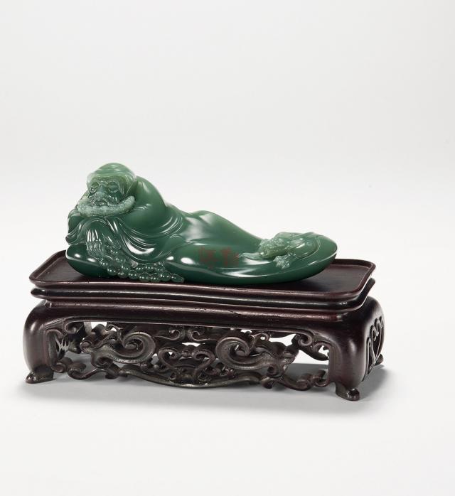 作者巧妙因材施艺,用流畅多变的线条精细雕琢出达摩祖师,细看达摩祖师呈侧卧状,手持念珠,双目微闭做沉思状,给人沉静、庄重之感,加上碧玉含蓄、沉稳的色彩,让观者不由肃穆。整体言之,作品造型巧妙,雕工精巧生动,是适宜观赏的佳作。款识: 文双